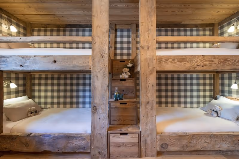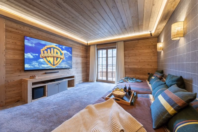 This is a luxurious 730 m² chalet with six en-suite bedrooms, sleeping up to 12 adults and 2 children. It offers a peaceful forest setting while being just a 5-minute drive from the Chaudanne ski lifts and the resort centre. The chalet features outstanding amenities including an indoor swimming pool, hammam, treatment room, outdoor hot tub, cinema room, and spacious living and dining areas with stunning mountain views.